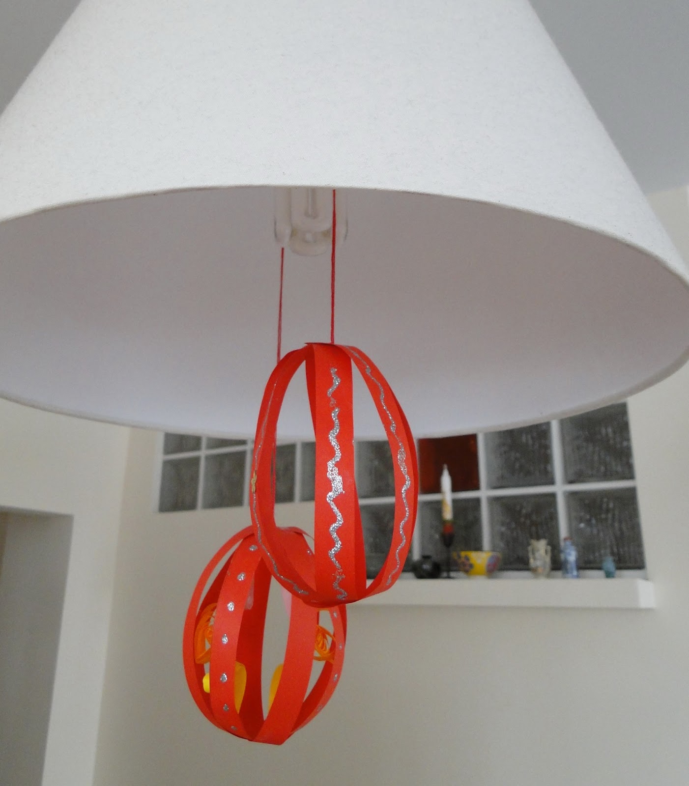 Színes A/4 papír rövidebb oldalából 3-4 db. 1,5 cm-es csíkot vágunk. A szeleteket csillagformára igazítjuk, középen összeragasztjuk őket a zsinórral együtt. A csillagot glitteres ragasztóval, flitterrel dekoráljuk. A flitterek felragasztását általában minden gyerek élvezi. Száradás után a csíkok másik végét egymáshoz illesztjük, és ragasztóval rögzítjük. Gömböt kapunk. Kicsit megnyomkodjuk, hogy tojás alakú legyen. A tojás belsejét esetleg hajtogatott papírszirmokkal is (quilling technika) tovább díszíthetjük.